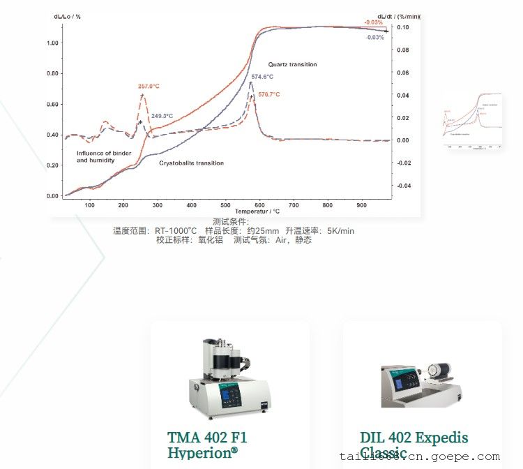 1#(藍(lán)色曲線)樣品含有較低含量的白硅石和較高含量的石英石,而2#(紅色曲線)樣品中含有較高含量的白硅石(導(dǎo)致200-300°C間較高的膨脹系數(shù))和較低含量的石英石。因此通過膨脹儀可以很方便的檢測(cè)出不同樣品間結(jié)構(gòu)組分的差異。