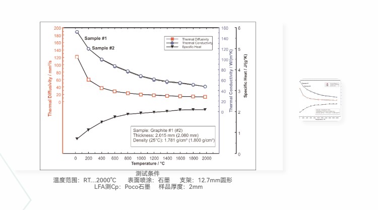 所測(cè)試的數(shù)據(jù)也是典型的石墨復(fù)合材料的結(jié)果。說(shuō)明LFA427能夠精確分析碳材料在超高溫下的熱物性數(shù)據(jù)。
