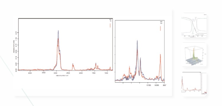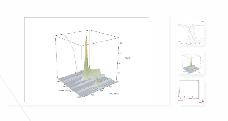 圖1為橡膠混合物的TG測試結(jié)果,其中黑色實(shí)線為TG曲線,綠色虛線為DTG曲線,灰色實(shí)線為紅外數(shù)據(jù)(樣品分解產(chǎn)生的氣體發(fā)生的紅外吸收強(qiáng)度)。當(dāng)發(fā)生熱分解時(shí),樣品的紅外吸收強(qiáng)度會(huì)明顯增加。紅外圖譜的3D顯示圖見右圖2和3,其中樣品在390和450℃的紅外圖單獨(dú)進(jìn)行的分析,并將波數(shù)為892 1/cm的紅外數(shù)據(jù)放大顯示以比較其不同之處,結(jié)果表明,樣品在390℃的分解為NR分解,而SBR分解溫度為450℃。