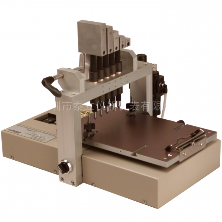 測試樣品固定在空氣壓縮驅(qū)動的檢測平臺上。五根獨立軸的刮指,可改變的重量和相機的刮指頭,真實作用在測試樣品表面。刮頭安裝在正確的臺架上 ,操作人員可通過移動使指定的刮指頭固定在平衡位置,從而使不規(guī)則的樣品也可以進行測試。