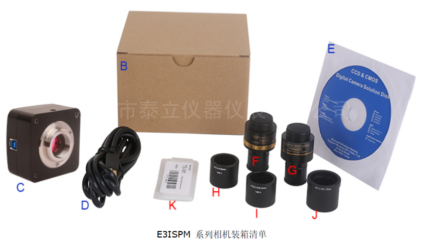 標(biāo)準(zhǔn)裝箱清單 A 包裝箱規(guī)格:L:52cm W:32cm H:33cm(20pcs, 12~17Kg/紙箱),上圖中未給出 B 包裝盒規(guī)格:L:15cm W:15cm H:10cm (0.58~0.6Kg/ box) C E3ISPM系列相機(jī) D 高速USB3.0 A公到B公鍍金頭數(shù)據(jù)線/2.0m E CD (驅(qū)動(dòng)以及應(yīng)用軟件, Ø12cm) 可選附件 F 可調(diào)焦式目鏡筒適配器 Dia.23.2mm目鏡筒轉(zhuǎn)C接口