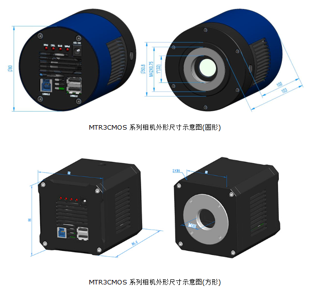 MTR3CMOS系列半導(dǎo)體制冷C/M42接口USB3.0 CMOS相機外形尺寸示意圖。