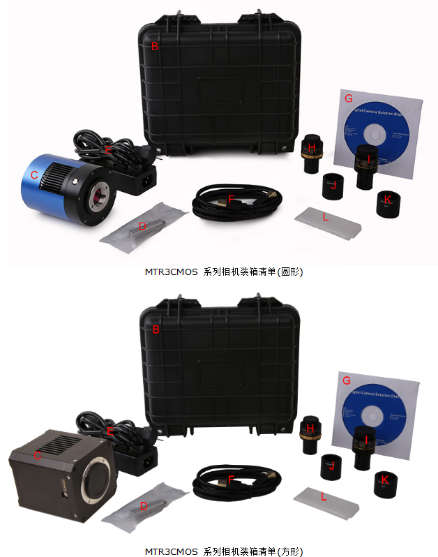 標準包裝列表 A 包裝箱規(guī)格 L:50cm W:30cm H:30cm (20pcs, 12~17Kg/ carton),這里在圖未示出 B 3-A儀器安全盒: L:28cm W:23.0cm H:15.5cm (1pcs, 2.8Kg/盒);外包裝紙箱尺寸:L:28.2cm W:25.2cm H:16.7cm C MTR3CMOS 系列相機一臺 D 干燥管 E 電源適配器: 輸入: AC 100~240V 50Hz/60Hz,輸出: DC 12V 3A F 高速USB3.0 A公到B公鍍金頭數(shù)據(jù)線/1.5m G CD (驅(qū)動及應(yīng)用軟件, Ø12cm)