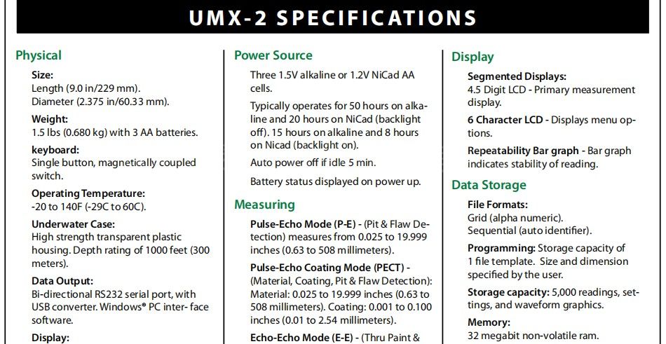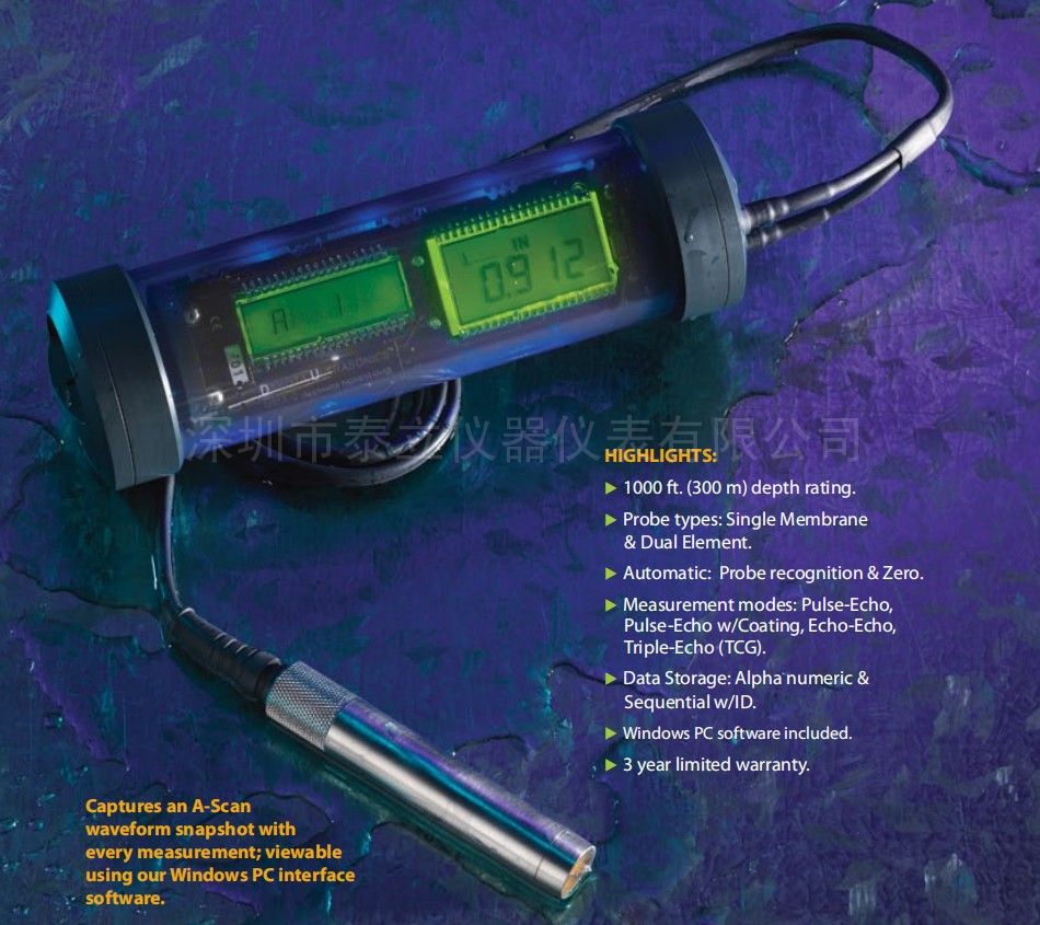 用于水下檢查,額定深度為300米。可存儲(chǔ)5000個(gè)數(shù)據(jù),每次測(cè)量的所有UMX-2設(shè)置,以及A-掃描波形。RS232數(shù)據(jù)接口,通過(guò)DakView軟件下載到計(jì)算機(jī)。
