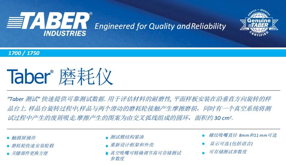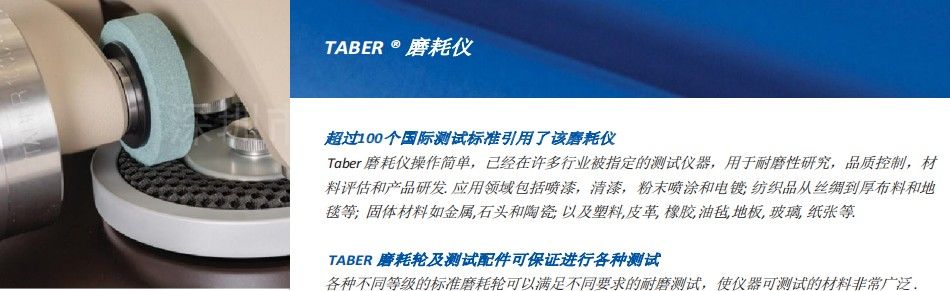 Taber 磨耗儀操作簡單,已經在許多行業(yè)應用廣泛的測試儀器,用于耐磨性研究,品質控制,材料評估和產品研發(fā) . 應用領域包括噴漆,清漆,粉末噴涂和電鍍 ; 紡織品從絲綢到厚布料和地毯等 ; 固體材料如金屬 , 石頭和陶瓷 ; 以及塑料 , 皮革 , 橡膠 , 油氈 , 地板 , 玻璃 , 紙張等。