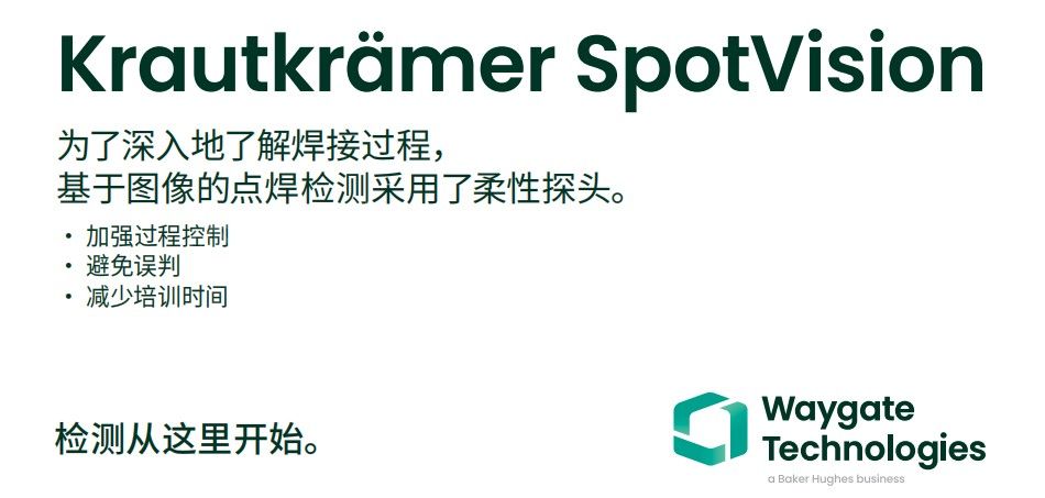Krautkrämer SpotVision 是 Waygate Technologies 用于接合處檢測的復雜解決方案組合的一部分。除了用于檢測點焊的SpotVision解決方案外,還包括用于檢測粘接的Krautkrämer Bond Scanner,其覆蓋率為100%,快速且易于闡釋。