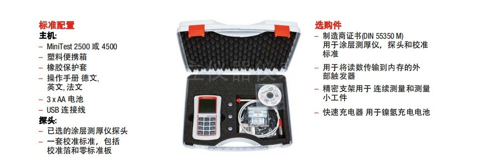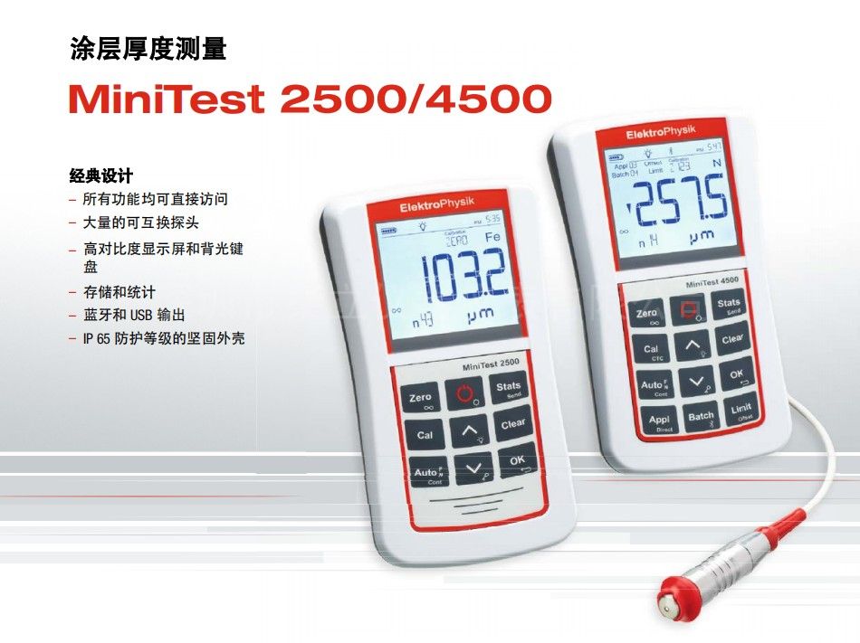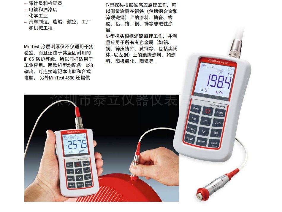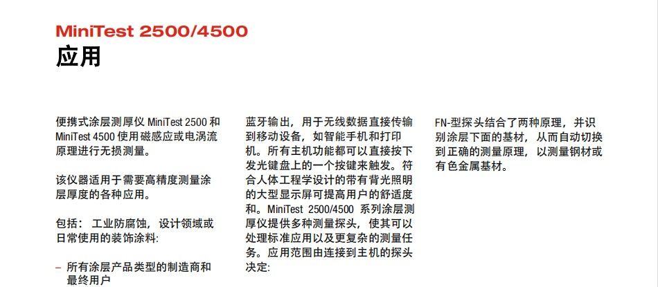 便攜式涂層測厚儀 MiniTest 2500 和MiniTest 4500 使用磁感應(yīng)或電渦流原理進行無損測量。該儀器適用于需要高精度測量涂層厚度的各種應(yīng)用。包括: 工業(yè)防腐蝕,設(shè)計領(lǐng)域或日常使用的裝飾涂料: