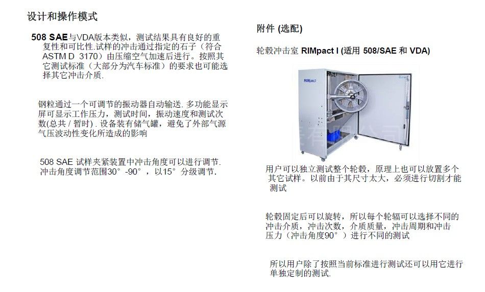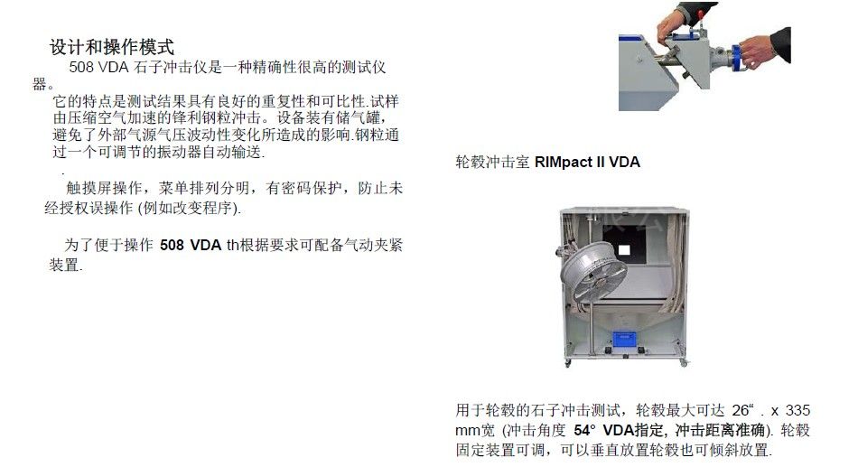 508 VDA 石子沖擊儀是一種精確性很高的測試儀器。它的特點是測試結(jié)果具有良好的重復性和可比性.試樣由壓縮空氣加速的鋒利鋼粒沖擊。設備裝有儲氣罐,避免了外部氣源氣壓波動性變化所造成的影響.鋼粒通過一個可調(diào)節(jié)的振動器自動輸送. 多功能顯示屏可顯示工作壓力,測試時間,振動速度和測試次數(shù)(總共 / 暫時)