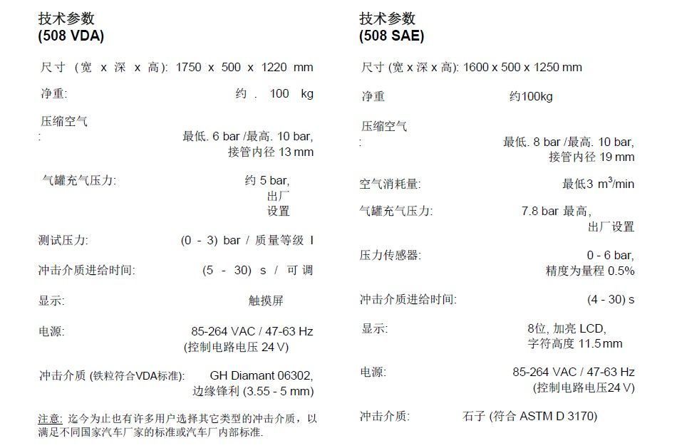 備注: 迄今為止也有許多用戶選擇其它類型的沖擊介質(zhì),符合不同國家汽車廠的標準,或汽車廠內(nèi)部標準.508 VDA 508 SAE 尺寸 (W x D x H) 1750 x 500 x 1220 mm 1600 x 500 x 1250 mm 凈重 約. 100 kg 約. 100 kg 壓縮空氣接口 *小 6 bar / *大. 10 bar,連接管內(nèi)徑 13 mm *低. 8 bar / *高. 10 bar,連接管內(nèi)徑 19 mm 充氣壓力 約. 5 bar,出廠設置 7.8 bar出廠設置 空氣流量 無 至少3立方/min 工作壓力 (0 - 3) bar / 質(zhì)量級別I 無 沖擊時間 (5 - 30) s / 可調(diào) (4 - 30) s 顯示 8 位, LCD顯示,高度11.5 mm 8位, LCD顯示, 高度 11.5 mm 壓力傳感器 0 - 6 bar,精度 0.5% 電源 85-264V交流電/47-63Hz(控制電壓24V) 85-264V交流電/47-63Hz(控制電壓24V) 沖擊介質(zhì) (鋼粒符合 VDA標準) GH Diamant 06302,邊緣鋒利 (3.55 – 5.0) mm