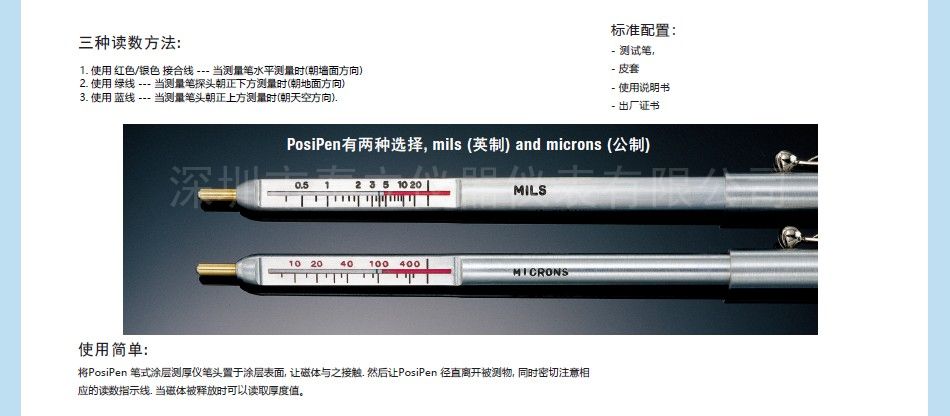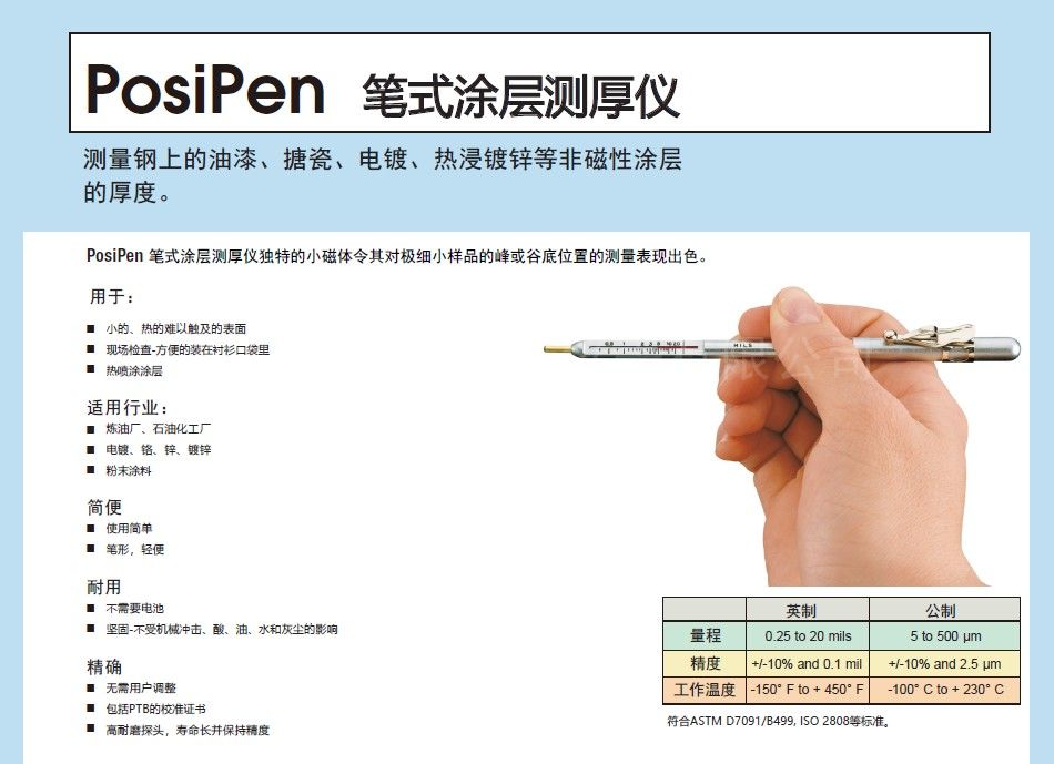 美國DeFelsko Posipen測量鐵基上非磁性涂層厚度(如油漆,電鍍層,熱浸鍍層),Posipen配備了一個非常小的特別的磁鐵,可以以探針的放松準確的測量非常小的工件,以及突出和凹陷的位置。