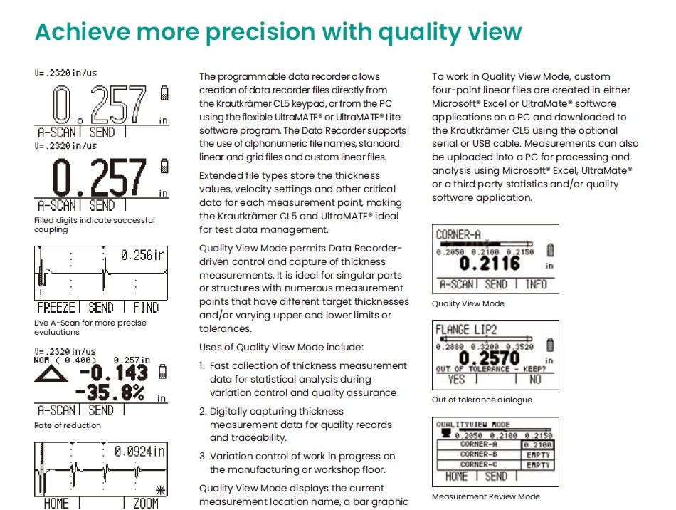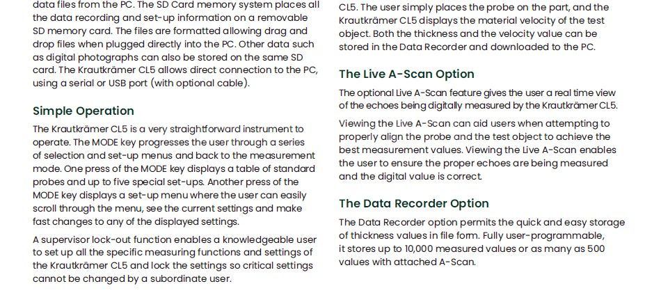 利用數(shù)據(jù)記錄器選項(xiàng)可以快捷地以文件形式存儲(chǔ)厚度值。可編程數(shù)據(jù)記錄器可以直接從CL 5鍵盤(pán)創(chuàng)建數(shù)據(jù)記錄器文件,或者利用靈活的UltraMATE® Lite或UltraMATE®軟件程序通過(guò)電腦創(chuàng)建。文件存儲(chǔ)每一測(cè)量點(diǎn)的厚度值、聲速設(shè)置以及其它關(guān)鍵數(shù)據(jù)。