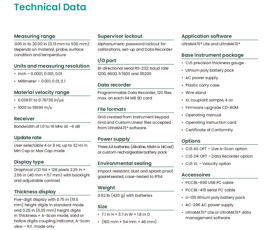 CL 5精密測(cè)厚儀具有功能全面、使用簡(jiǎn)便、體積小巧和結(jié)構(gòu)牢固的優(yōu)點(diǎn),是測(cè)量材料厚度和檢查鋼板腐蝕的*為小巧的儀器。用戶可以在常規(guī)、*小值掃描、*大值掃描、差值/減薄率、厚度+A掃描(選件)或聲速測(cè)試(選件)6種不同的操作模式中進(jìn)行選擇。所有數(shù)據(jù)記錄和設(shè)置信息可存儲(chǔ)在SD卡上。