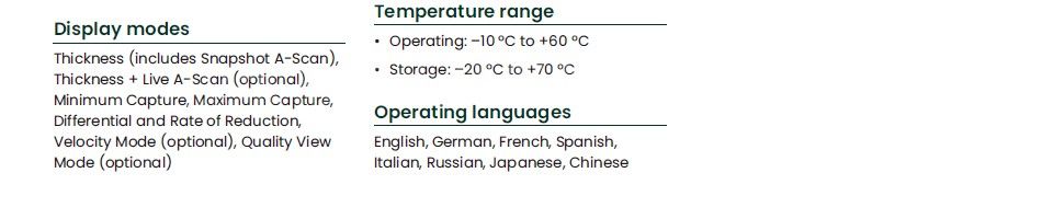 l六種測(cè)量和顯示模式:常規(guī)、*小厚度捕獲、*大厚度捕獲、差值和減薄率、聲速測(cè)試(要求配有CL 5V選項(xiàng))和厚度+A掃描(要求配有實(shí)時(shí)A掃描選項(xiàng))。