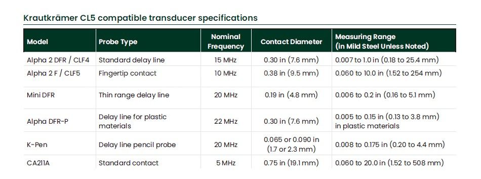 探頭選型:探頭型號(hào) 特征 接觸直徑mm 測(cè)量范圍(鋼材,另有說(shuō)明除外) Alpha 2 DFR/CLF4 標(biāo)準(zhǔn)延遲探頭 7.6 0.18至25.4mm Alpha 2 F/CLF5 指尖接觸式探頭 9.5 1.52至254mm Mini DFR 小延遲探頭 4.8 0.13至5.1mm Alpha DFR-P 塑料材質(zhì)用延遲探頭 7.6 0.13至3.8mm,在塑料材質(zhì)中 K-pen 延遲筆式探頭 1.7或2.3 0.02至4.4mm CA211A 標(biāo)準(zhǔn)接觸式探頭 19.1 0.06至508mm