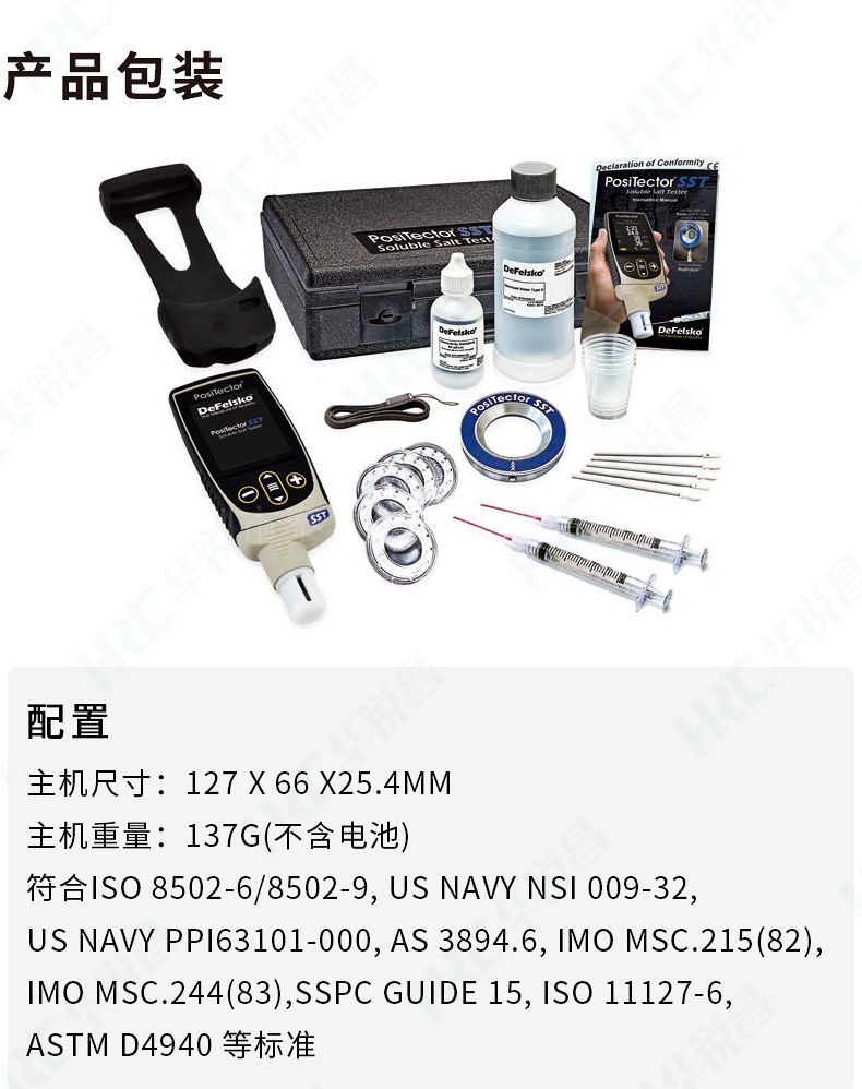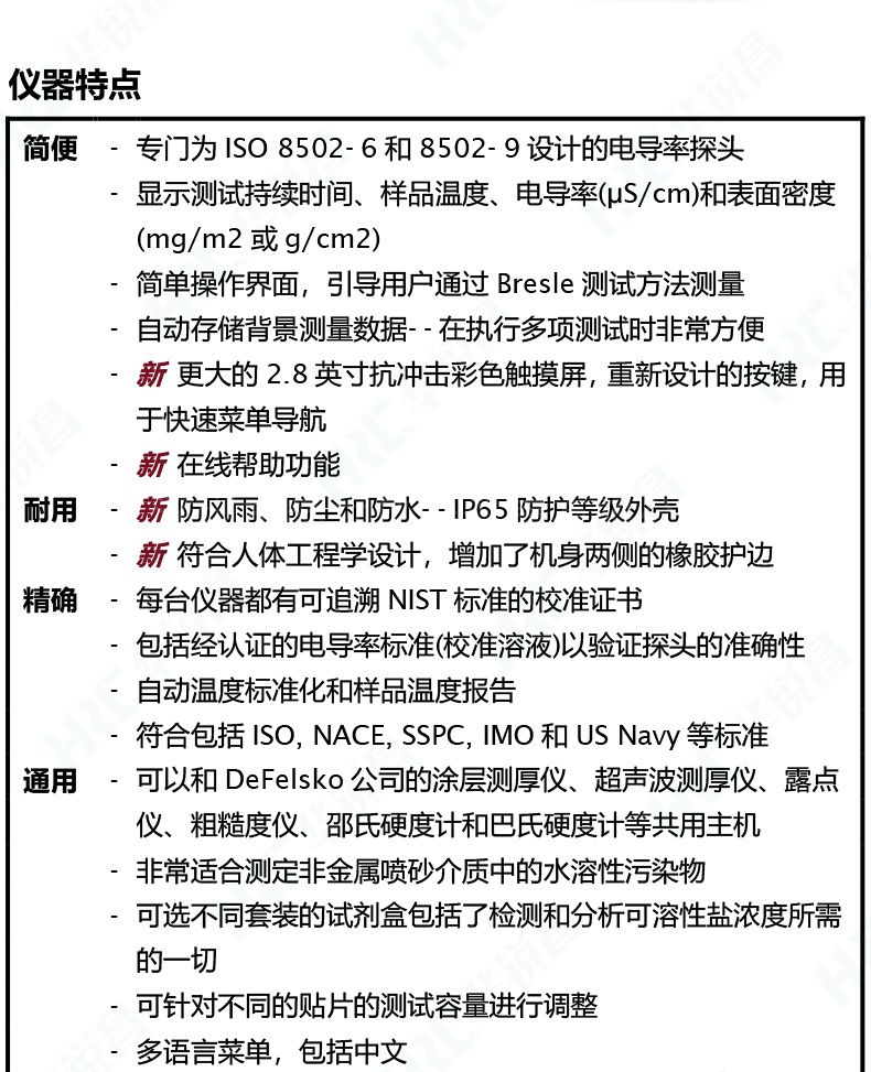 可以和 DeFelsko 公司的涂層測厚儀、超聲波測厚儀、露點(diǎn)儀、粗糙度儀、邵氏硬度計和巴氏硬度計等共用主機(jī)非常適合測定非金屬噴砂介質(zhì)中的水溶性污染物可選不同套裝的試劑盒包括了檢測和分析可溶性鹽濃度所需的一切