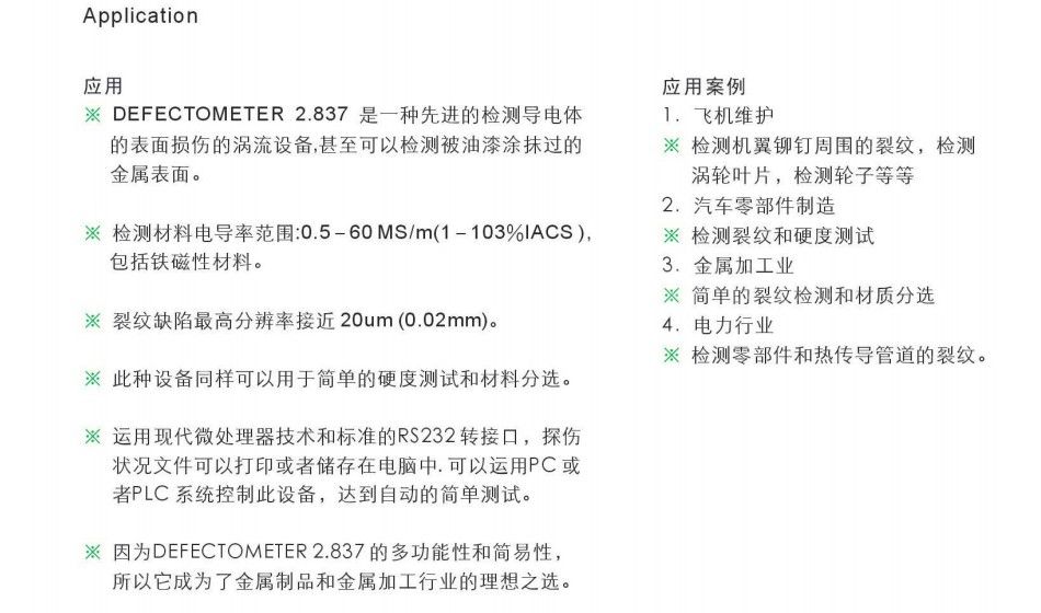 *就像它以前的產(chǎn)品一樣,DEFECTOMETER2.837是基于高靈敏的共振法原理,甚至微小的裂紋,小到深度只有20um ,都可以在電導(dǎo)材料表面被檢測(cè)到,檢測(cè)材料電導(dǎo)率范圍:0.5-60MS/m(1-103%IACS),為了保證它的高精度,電導(dǎo)率范圍為3個(gè)區(qū)間:“Aust”奧氏體鋼和鈦合金; “NFe”,有色金屬; “Fe”,所以的鐵磁性材料。