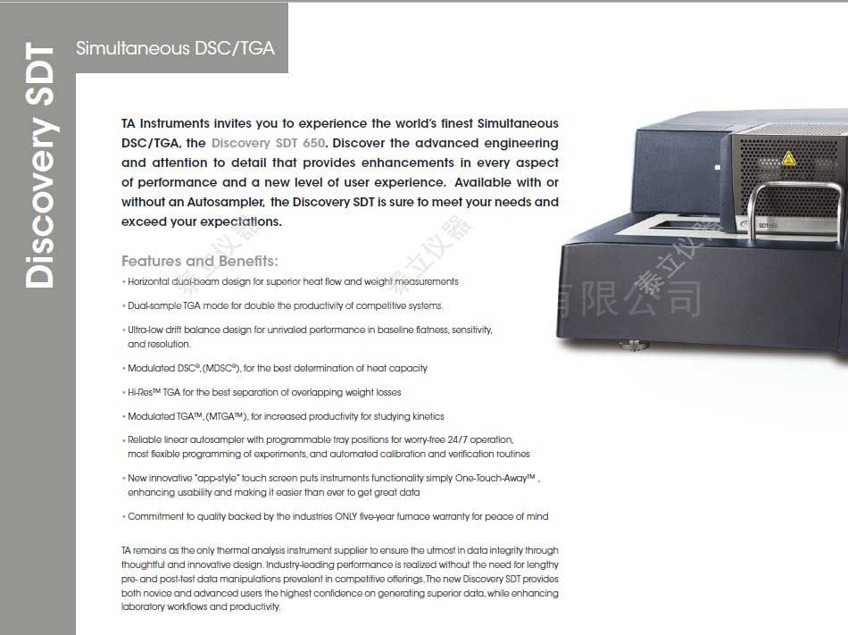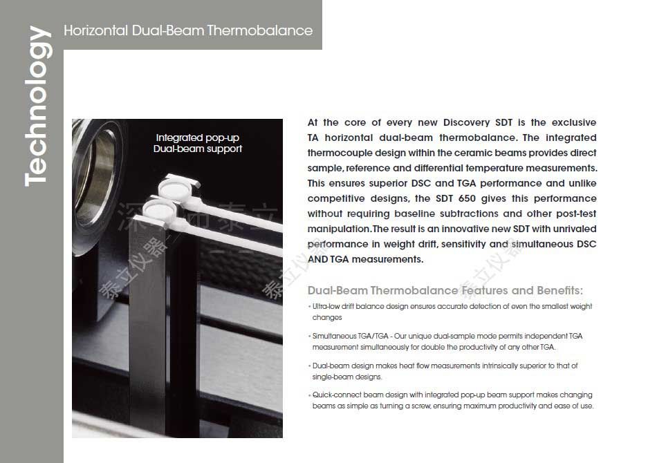 每一款新型 Discovery SDT 均以 TA 獨有的水平雙臂熱天平為核心。陶瓷臂梁中集成熱電偶設計,可直接測量樣品溫度、參比溫度及差溫。這可確保 DSC 和 TGA 的性能達到優(yōu)異水平。與競爭對手的系統(tǒng)設計不同,SDT 650 無需執(zhí)行基線扣除及其他測試后處理操作。因此,創(chuàng)新型 SDT 在重量漂移、靈敏度和同步 DSC/TGA 測量方面擁有刪除的優(yōu)越性能。