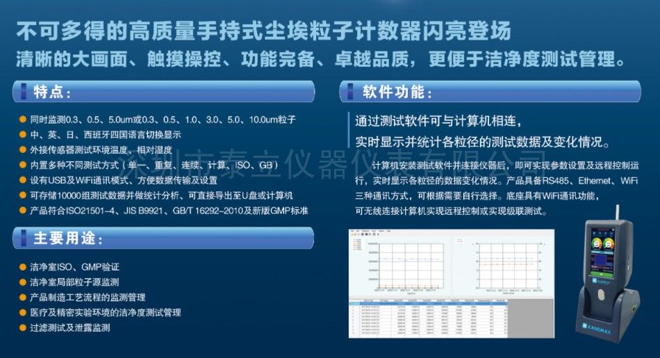 不可多得的高質(zhì)量手持式塵埃粒子計(jì)數(shù)器閃亮登場(chǎng)清晰的大畫(huà)面、觸摸操控、功能完備、卓越品質(zhì),更便于潔凈度測(cè)試管理。