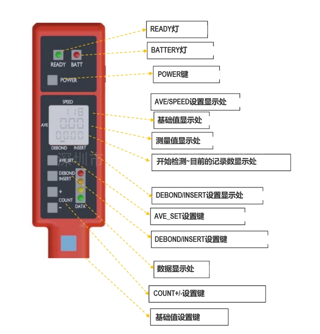 該儀器的敲擊頭由一電磁線圈驅(qū)動,敲擊頭上的傳感器可檢測到材料的脫粘情況,并通過儀器上不同顏色的發(fā)光二極管來顯示脫粘程度,當紅燈亮時,儀器的蜂鳴器會同時發(fā)出聲音報警,該儀器既可檢測材料的脫粘情況,也可檢測蜂窩內(nèi)部的鑲嵌物,檢測的數(shù)據(jù)可通過 WP-632M顯示/存儲單元顯示出來。
