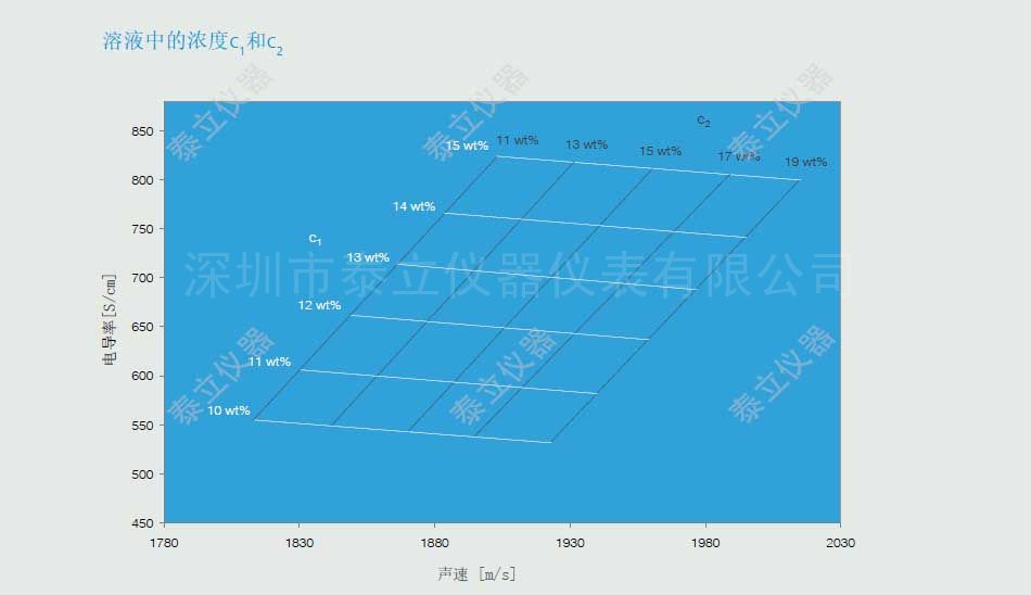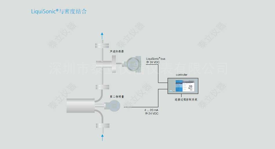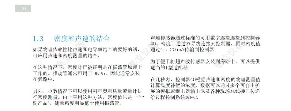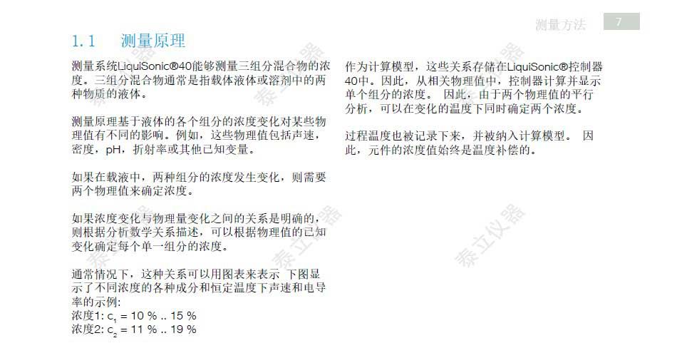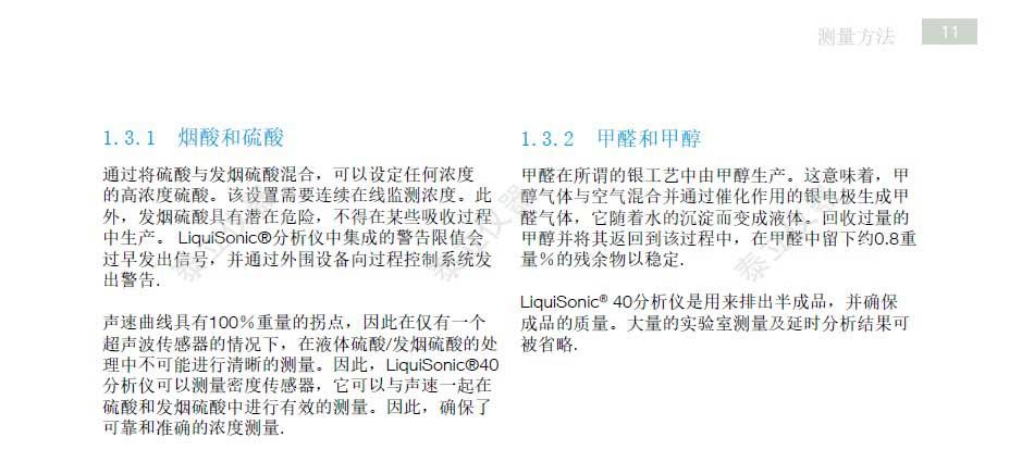 LiquiSonic采用一種接觸式的超聲波原理測量和分析方法, 傳感器原理基于聲速和物質(zhì)密度之間的關(guān)系.通過測得聲波穿過固定距離值S(超聲波信號發(fā)出器與接收器的距離)所需要的時間T,可測出聲速V,并計算出過程液體中介質(zhì)的濃度與密度, 以及其它的常用數(shù)值范圍。