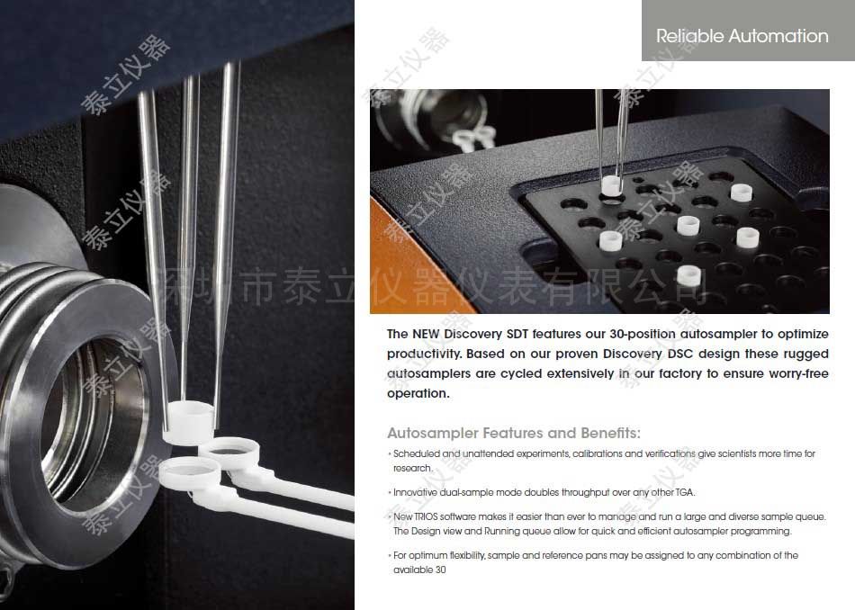 每一款新型 Discovery SDT 均以 TA 的水平雙臂熱天平為核心。陶瓷臂梁中集成熱電偶設(shè)計(jì),可直接測(cè)量樣品溫度、參比溫度及差溫。這可確保 DSC 和 TGA 的性能達(dá)到優(yōu)異水平。與競(jìng)爭(zhēng)對(duì)手的系統(tǒng)設(shè)計(jì)不同,SDT 650 無(wú)需執(zhí)行基線扣除及其他測(cè)試后處理操作。因此,創(chuàng)新型 SDT 在重量漂移、靈敏度和同步 DSC/TGA 測(cè)量方面擁有刪除的優(yōu)越性能.