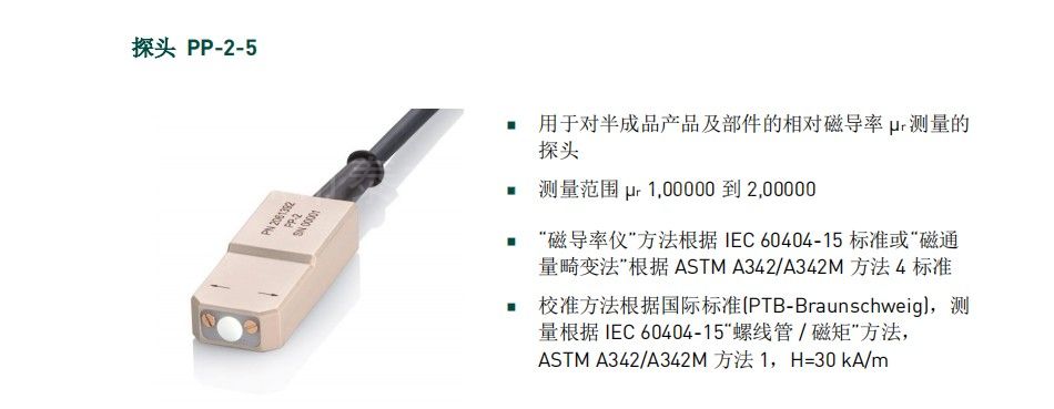 磁導率µ表示材料在磁場中可被磁化的程度。磁導率µ等于磁介質中磁感應強度B與磁場強度H之比。物理常數(shù)µ0是在真空中的磁導率。相對磁導率µr是µ 與µ0之比。帶有磁導率探頭的MAGNETOSCOP 和 MAGNETOMAT 磁力計根據(jù)IEC 60404-15, ASTM A342M 和 VG 95578標準測量原材料或已加工的部件。無需制作特殊尺寸或形狀的測量樣件。