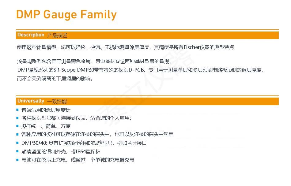 接觸式無(wú)損涂層厚度測(cè)量現(xiàn)已提升到新的水平。Fischer全新的DMP系列以其全新的設(shè)計(jì)和數(shù)字探頭,以及Fischer DataSuite和許多其他創(chuàng)新樹立了新標(biāo)準(zhǔn)。體驗(yàn)一下該產(chǎn)品系列。