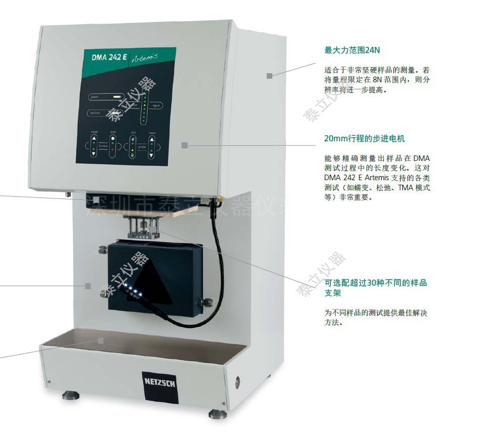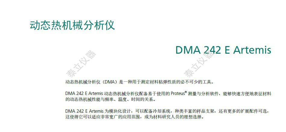 并可進行蠕變、應力松弛、應力掃描、應變掃描等特殊類型的測量。以及針對測量結(jié)果進行動力學計算與頻率外推。這一切使得 DMA 242 E 成為一臺適應面非常寬廣的全能型動態(tài)熱機械分析儀。DMA 242E Artemis 配備易于使用的 Proteus 測量與分析軟件,能夠快速而方便地表征材料的動態(tài)熱機械性能與頻率、溫度、時間的關(guān)系。