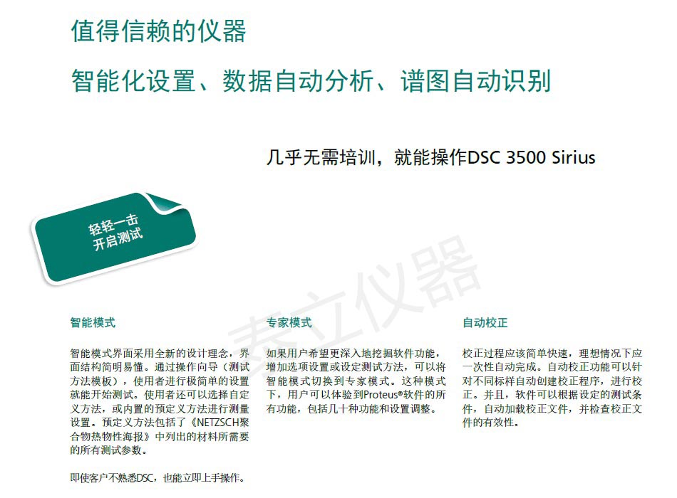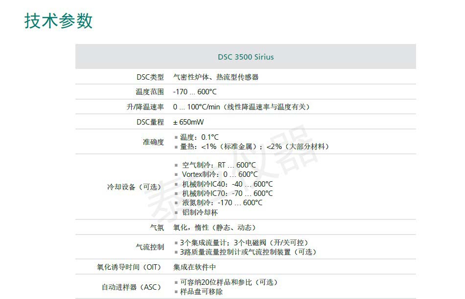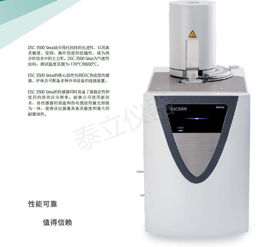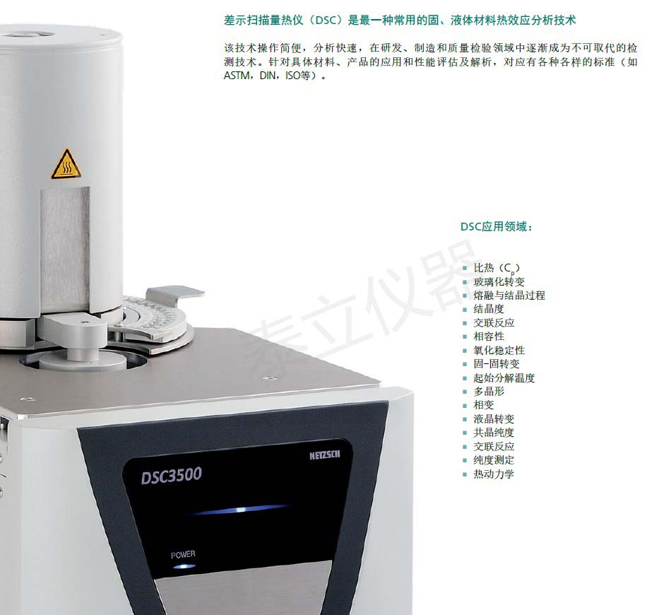 DSC 3500 Sirius 結(jié)合新技術(shù),具有很高的靈敏度,測量系統(tǒng)穩(wěn)固耐用、易于操作。不僅可用于質(zhì)量檢測和失效分析的常規(guī)測試,也可以用于紡織技術(shù)、食品生產(chǎn)、包裝行業(yè)、高分子行業(yè)和化妝品行業(yè)甚至有機或無機材料的表征。