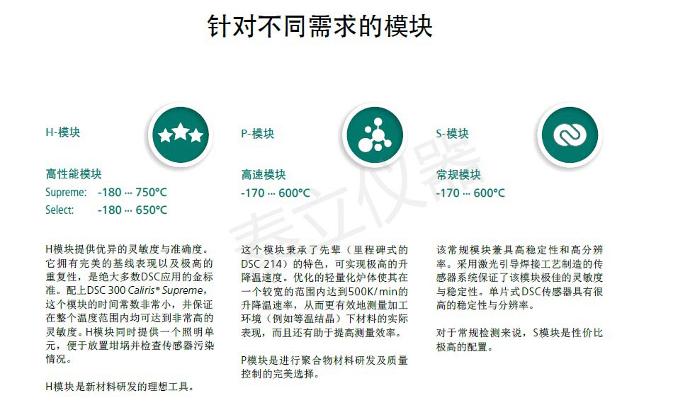 DSC 300 Caliris Select 可選配不同特性的傳感器+爐體模塊。配備S模塊則構(gòu)成了一臺(tái)高精度、可靠的DSC系統(tǒng),且性價(jià)比極高,*大工作溫度區(qū)間為-170...650°C。