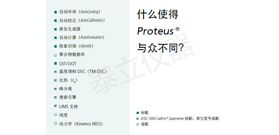 測(cè)定吸熱/放熱行為:可確定起始點(diǎn),峰值,拐點(diǎn)和終止點(diǎn)溫度,可進(jìn)行自動(dòng)峰搜索。峰面積/熱焓計(jì)算:可選多種不同類型基線,可進(jìn)行部分面積分析。峰的綜合分析:在一次標(biāo)注中可同時(shí)得到溫度、面積、峰高與峰寬等各種信息。結(jié)晶度計(jì)算。全面的玻璃化轉(zhuǎn)變分析。自動(dòng)基線扣除。比熱測(cè)試與分析。 BeFlat:使用多項(xiàng)式擬合,對(duì)不同升溫速率下的基線進(jìn)行擬合扣除。 Tau-R 模式: 將儀器的時(shí)間常數(shù)與熱阻因素納入計(jì)算并加以扣除,能得到更尖銳的 DSC 峰。 TM-DSC(溫度調(diào)制 DSC,可選):可以從總熱流曲線中分離可逆熱流(熱力學(xué))和不可逆熱流(動(dòng)力學(xué))效應(yīng)。另有符合 GLP、GMP、21CFR 等標(biāo)準(zhǔn)的特別軟件功能。