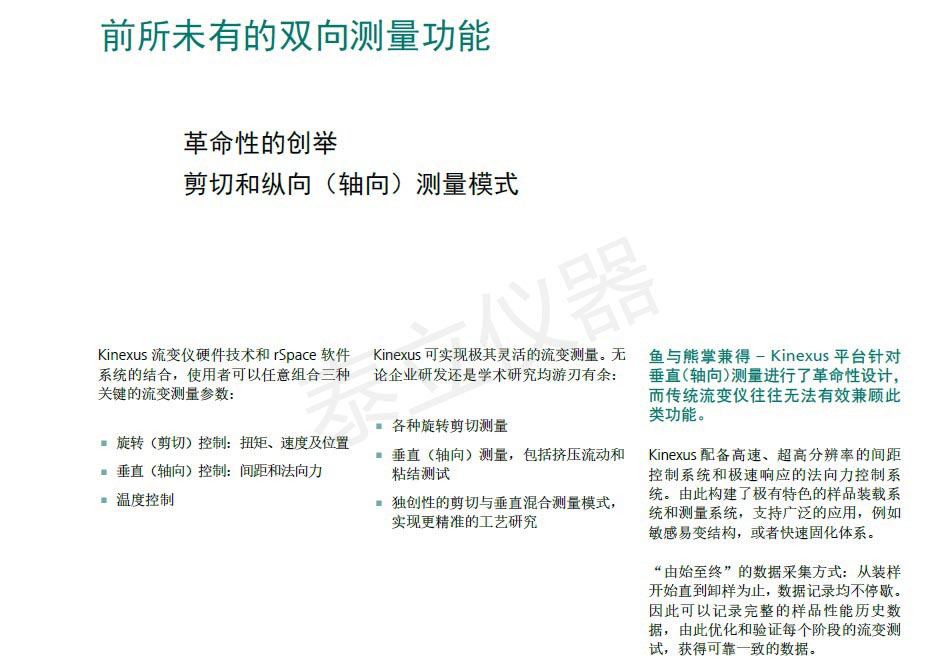 Kinexus 流變儀具備前所未有的雙向測量功能,既可實(shí)現(xiàn)傳統(tǒng)流變儀的切向測量,也可垂直(或軸向)測量,由此可兼顧液相分散體系和其它復(fù)雜流體或軟固體的表征。