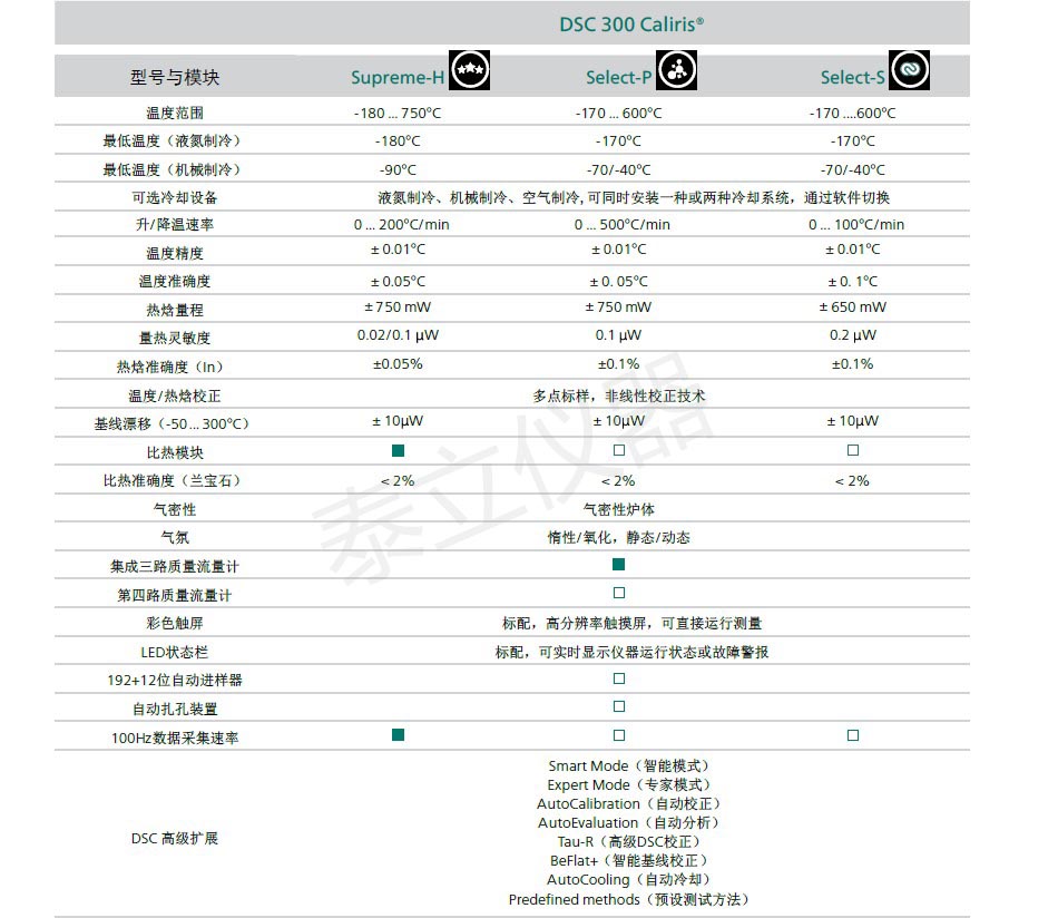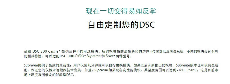 DSC 300 Caliris Select 可選配不同特性的傳感器+爐體模塊。配備S模塊則構(gòu)成了一臺(tái)高精度、可靠的DSC系統(tǒng),且性價(jià)比極高,*大工作溫度區(qū)間為-170...650°C。