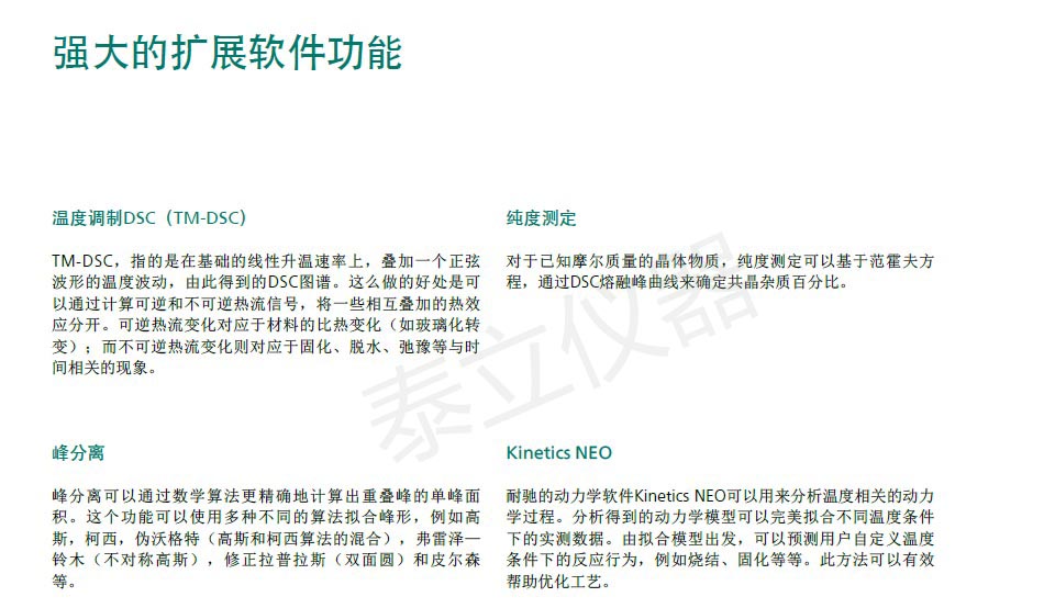 DSC擴(kuò)展功能: 智能模式、專家模式、Tau-R高級(jí)校正、BeFlat+智能基線校正、 自動(dòng)冷卻、預(yù)設(shè)測(cè)試方法 -