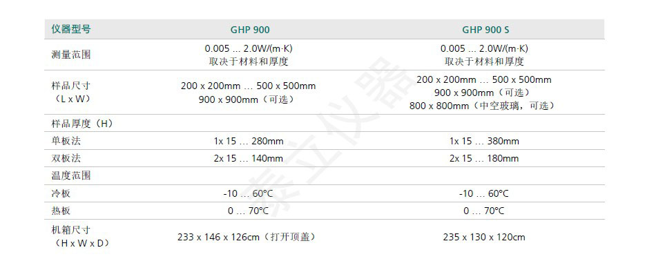 • 保護熱板法測量設(shè)備符合 ISO 8302,ASTM C177,EN 1946-2,EN 12664,EN 12667,EN 12939 與 EN 674(GHP 900 S)標準