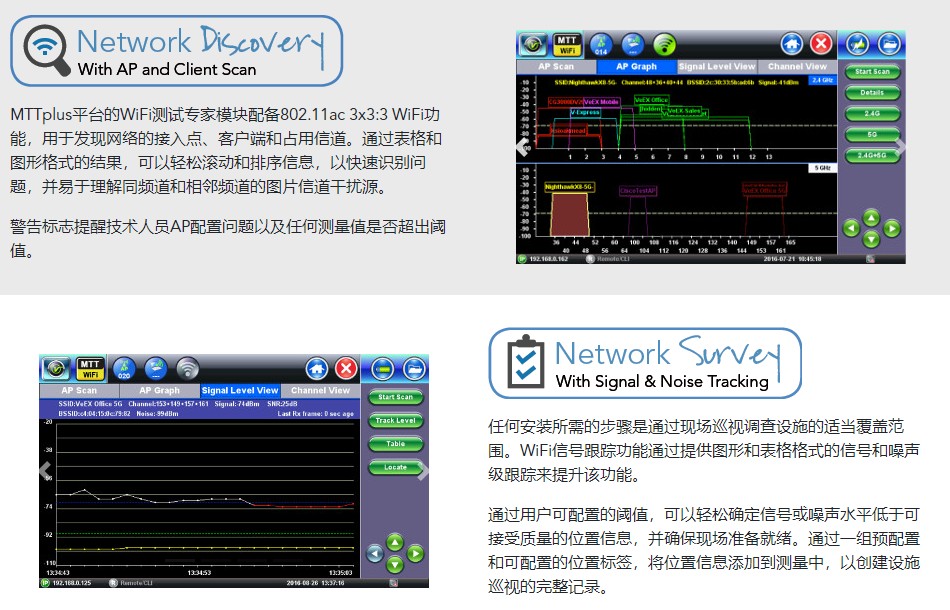測(cè)試覆蓋從信號(hào),噪聲功率到信道占用率等情況,獨(dú)特的WIFI頻譜分析功能可以幫助在WIFI和非WIFI干擾下的性能問(wèn)題,V-Perf功能提供wifi到有線網(wǎng)絡(luò)響應(yīng)器之間的流量下載/上傳測(cè)試功能,該功能可以評(píng)估WIFI網(wǎng)絡(luò)有負(fù)載情況下的網(wǎng)絡(luò)性能。