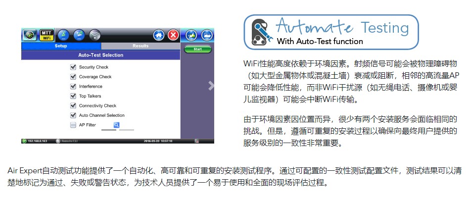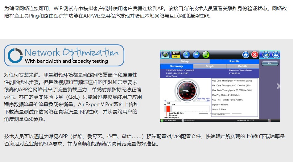 VeEX公司的WiFi測(cè)試儀是一款能提供可重復(fù)安裝步驟的測(cè)試工具,完全超越了射頻層面的分析,并可以提供完整的性能測(cè)試,測(cè)試*終用戶業(yè)務(wù)負(fù)載下的網(wǎng)絡(luò)性能