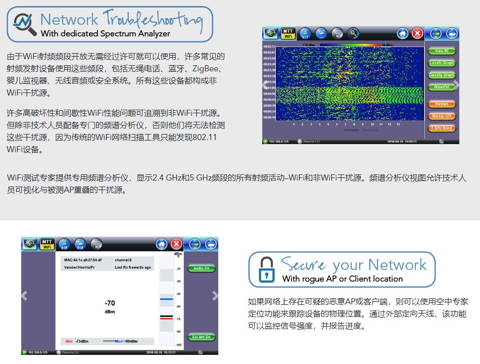 雙頻帶2.4GHz和5GHz頻譜分析功能可以非常容易發(fā)現(xiàn)和查找WiFi以及非WiFi干擾情況