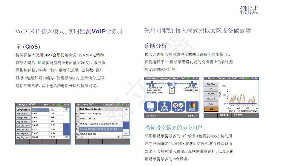 將網(wǎng)探接入使用SIP(會話初始協(xié)議)的VoIP電話和網(wǎng)絡(luò)之間后,即可實時監(jiān)測業(yè)務(wù)質(zhì)量(QoS)。服務(wù)質(zhì)量指標(biāo)包括:抖動、時延、數(shù)據(jù)包總數(shù)、丟包數(shù)、源/目標(biāo)IP地址和端口編號。使用標(biāo)準(zhǔn)SIP,顯示信令過程,包括呼叫拾取、兩個電話的電話號碼和持續(xù)時間。