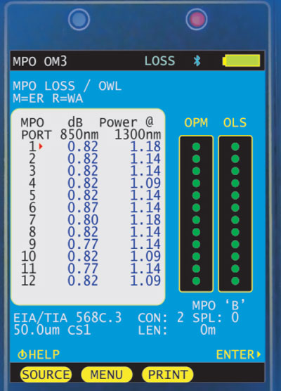 對于高速通信,尤其是在數(shù)據(jù)中心環(huán)境中,多對光纖鏈路比單對光纖鏈路更為普遍。 OWL DataCenter 12系列測試套件可自動測試12芯MPO光纜和鏈路,而無需購買其他配件。 更高密度的連接(即24、36、48、60或72)也可以使用MPO分支光纜進行測試。
