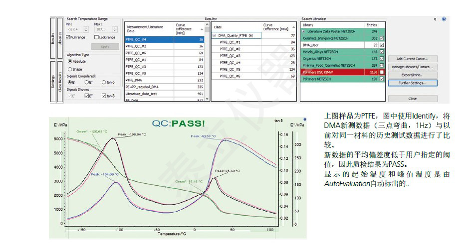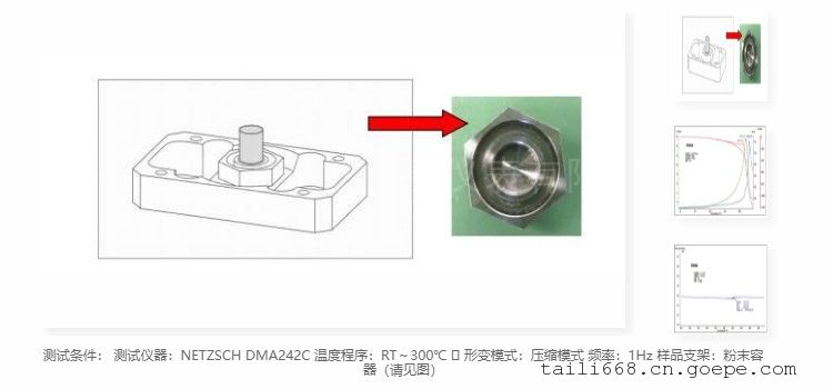 聚酰亞胺是分子結構含有酰亞胺基鏈節(jié)的芳雜環(huán)高分子化合物,英文名 Polyimide(簡稱 PI),可分為均苯型 PI,可溶性 PI,聚酰胺-酰亞胺(PAI)和聚醚亞胺(PEI)四類。 PI 是目前工程塑料中耐熱性*好的品種之一,有的品種可長期承受 290℃高溫、短時間承受 490℃的高溫,另外力學性能、 耐疲勞性能、難燃性、尺寸穩(wěn)定性、電性能都好,成型收縮率小,耐油、一般酸和有機溶劑,不耐堿,有優(yōu)良的耐摩擦,磨耗性能。聚酰亞胺作為一種特種工程材料,已廣泛應用在航空、航天、微電子、納米、液晶、分離膜、激光等領域。近來,各國都在將聚酰亞胺的研究、開發(fā)及利用列入 21 世紀*有希望的工程塑料之一。 樣品 PI-peak 呈粉末狀,使用特殊粉末支架壓縮模式進行測試。測試數(shù)據(jù)可見,粉末樣品表現(xiàn)和通常的塊狀樣品有很大的差別。隨著溫度的升高,樣品粉末內(nèi)部發(fā)生重排導致堆積密度變大,同時施加在樣品上的作用力也會加大堆積密度。因此可見樣品的尺寸不斷收縮,dL 曲線表征樣品的長度變 化情況,樣品在玻璃化轉(zhuǎn)變之前尺寸收縮比較緩慢,在 213℃以后尺寸收縮非常顯著(紅色曲線)。同時,由于樣品密度加大導致樣品變硬,樣品的表觀儲能模量 E'出現(xiàn)增大趨勢。 在接近玻璃化轉(zhuǎn)變的區(qū)域,樣品重排現(xiàn)象更加明顯,表現(xiàn)為表觀模量 E'迅速增大。開始玻璃化轉(zhuǎn)變之后,E'迅速下降,這是因為樣品已經(jīng)到達玻璃化轉(zhuǎn)變區(qū)域,樣品迅速變軟,圖上可見 E'的曲線出現(xiàn)一個峰,峰值為 221℃。損耗因子 tan d 在玻璃化轉(zhuǎn)變過程中表現(xiàn)為一個峰,峰值溫度為 232.℃。此溫度和 DSC 測量得到的玻璃化轉(zhuǎn)變溫度(221℃)很接近(右圖)。