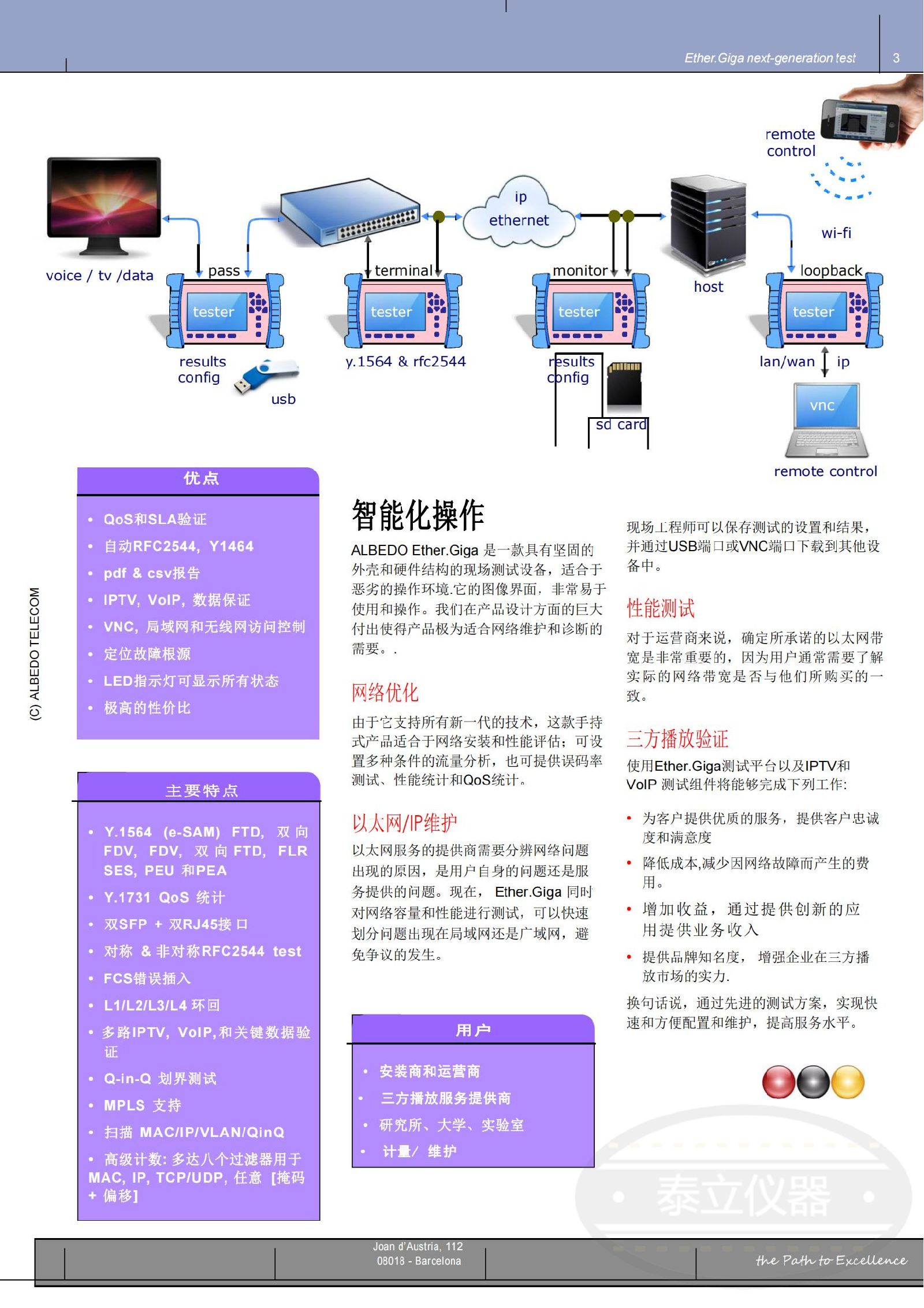 ALBEDO Ether.Giga是一款便攜式、經(jīng)濟(jì)實(shí)用但是功能豐富的千兆以太網(wǎng)測(cè)試產(chǎn)品,Ether.Giga不但具有誤碼率測(cè)試和RFC2544等常見(jiàn)功能,還支持Y.1564,Y.1731和FCS錯(cuò)誤插入等新功能,因此能夠驗(yàn)證新的多方服務(wù)的QoS和SLA。設(shè)備配備了雙SFP光口和雙RJ45測(cè)試接口,以及4.2英寸彩色觸摸屏,現(xiàn)場(chǎng)技術(shù)人員可快速,輕松地驗(yàn)證以太網(wǎng)服務(wù)并對(duì)其進(jìn)行故障排除,適用于包括VoIP,IPTV,VoD,高性能計(jì)算,虛擬化服務(wù),數(shù)據(jù)中心和存儲(chǔ)等需要很高水平的以太網(wǎng)應(yīng)用帶寬的網(wǎng)絡(luò)環(huán)境。