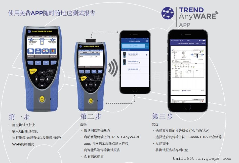 生成PDF或CSV格式的測試報告,并通過免費TREND AnyWARE App向智能終端發(fā)送測試報告