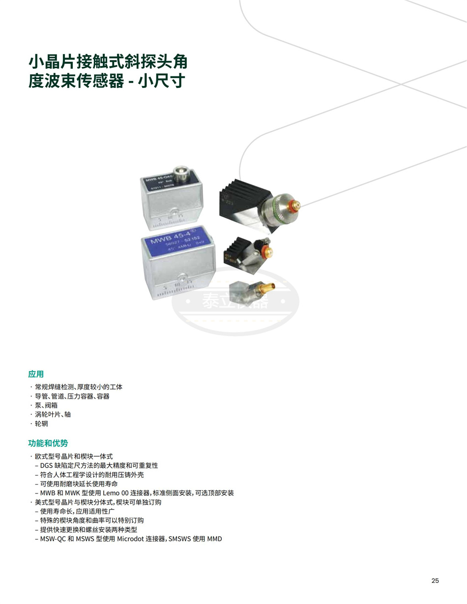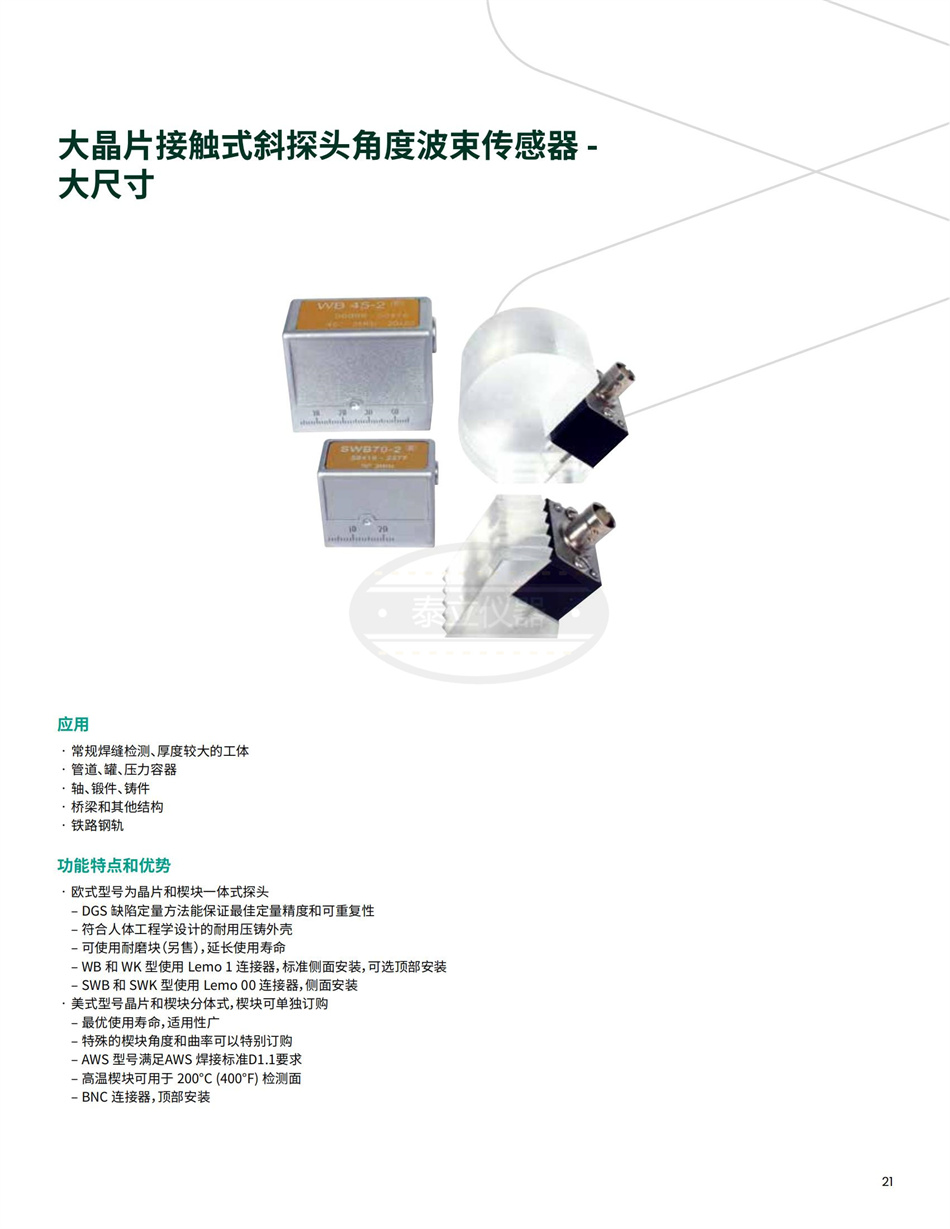 ·晶片低聲阻抗提高了斜探頭、延遲探頭和水浸探頭的性能,與塑料和水的聲阻抗匹配效果好。