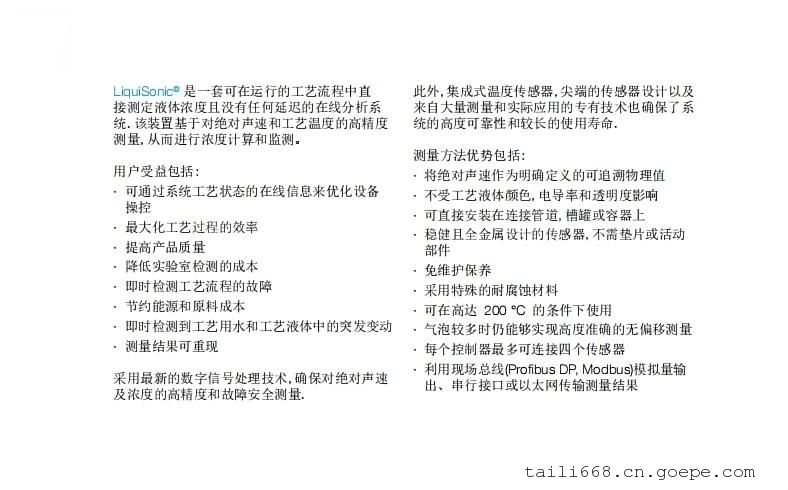 除濃度和密度的測(cè)量外,主要應(yīng)用范圍還包括相界面檢測(cè)或復(fù)雜反應(yīng)監(jiān)控,例如聚合反應(yīng)和結(jié)晶化。我們的LiquiSonic®測(cè)量和分析系統(tǒng)能夠確保*優(yōu)產(chǎn)品質(zhì)量和*高設(shè)備安全。由于其對(duì)資源的高效利用,其同樣有助于降低成本,并因此廣泛應(yīng)用于各種行業(yè),例如化工與制藥、鋼鐵、食品技術(shù)、機(jī)械及設(shè)備工程、汽車制造等等。