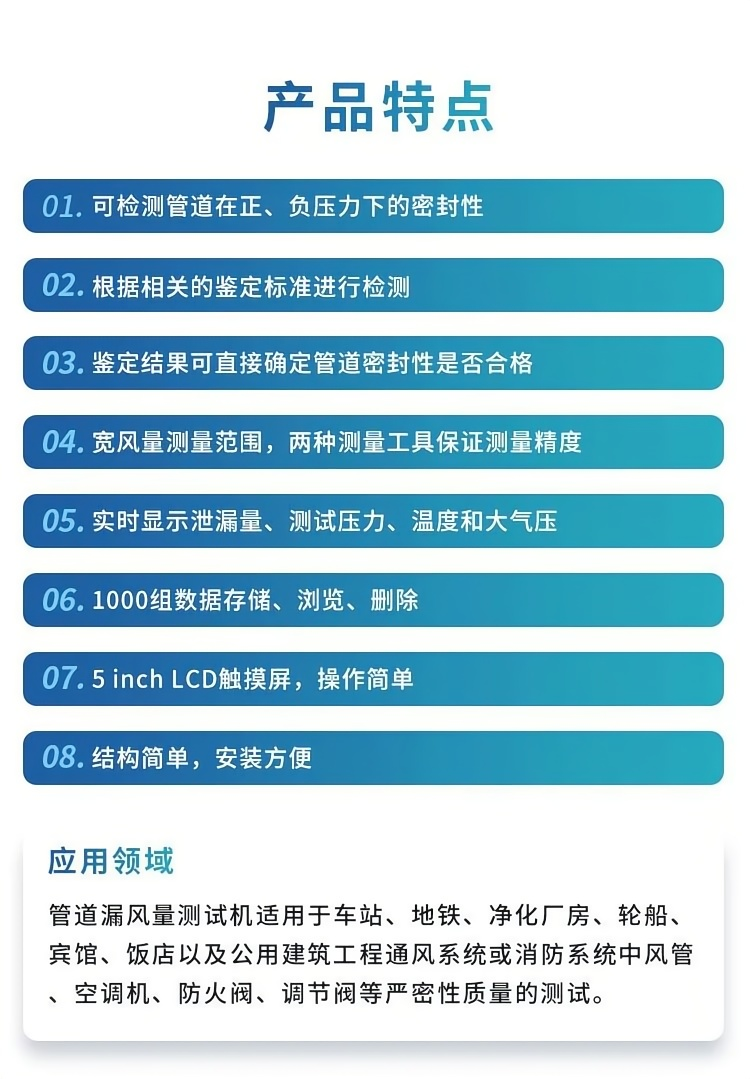 管道漏風(fēng)量測(cè)試機(jī)主要用于空調(diào)管道的密封性測(cè)試,測(cè)試通風(fēng)空調(diào)中漏風(fēng)量的專用設(shè)備,適用于賓館、飯店以及公用工程通風(fēng)空調(diào)系統(tǒng)中風(fēng)管、空調(diào)機(jī)、防火閥、調(diào)節(jié)閥等嚴(yán)密性質(zhì)量的測(cè)試。