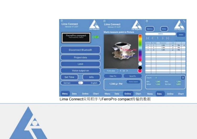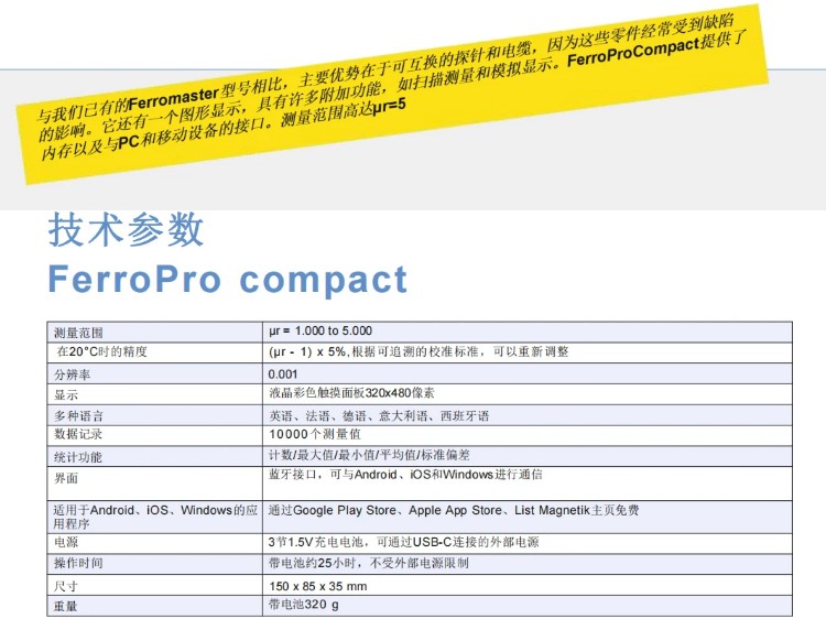FerroPro Compact提供了內(nèi)存以及與PC和移動設(shè)備的接口。測量范圍高達(dá)µr=5
