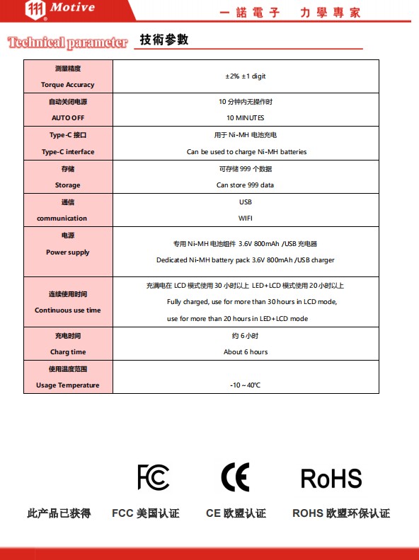 型號 測量范圍 棘輪頭 尺寸 尺寸 重量 棘輪頭 *小 *大 *小刻度 有效長 全長 手柄長度 [N·m] [N·m] [mm] L [mm] L’ ;[mm] I 1 [mm] [kg] MEM360N1D2-W 36-360 0.4 1/2’ 12.7 548 590 130 1.45 14*18 1/2 MEM500N3D4-W 50-500 0.5 3/4’ 19 782 888 170 3.75 14*18 3/4 MEM850N3D4-W 85-850 1 3/4’ 19 1240 1283 190 5.14 14*18 3/4 序號 設置項目 顯示 出廠設定 選擇項目 1 測量模式 SEL MODE-M MODE-T 2 測量單位 USEL N.m Kgf.cm/ Kgf.m /Lbf.in /Lbf.ft 3 上限值 HI 0 0 4 下限值 Lo 0 0 5 緊固方向 tUrn CW CCW 6 自動儲存、復位 Ar 0.0 0.1~5.0 7 蜂鳴器輸出 bU ON OFF 8 顯示模式 dSP LED LCD 9 默認設定 dFLt DFT-N DFT-Y 10 時:分:秒 rtC1 無 - 11 年:月:日 rtC2 無 - -