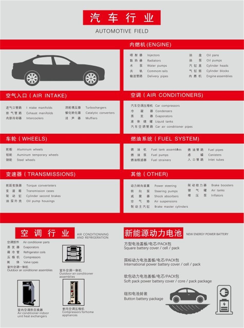 新能源動(dòng)力電池行業(yè)、鋰電池蓋板、方殼、圓柱、紐扣電池、PACK包、油箱油管、冷疑器、蒸發(fā)器、輪轂、減震器、壓縮機(jī)、氙氣燈、環(huán)網(wǎng)柜、連接器、散熱板、發(fā)熱管、水下設(shè)施設(shè)備、儀器儀表、化工廠、食品藥品、核電站、航空航天等.
