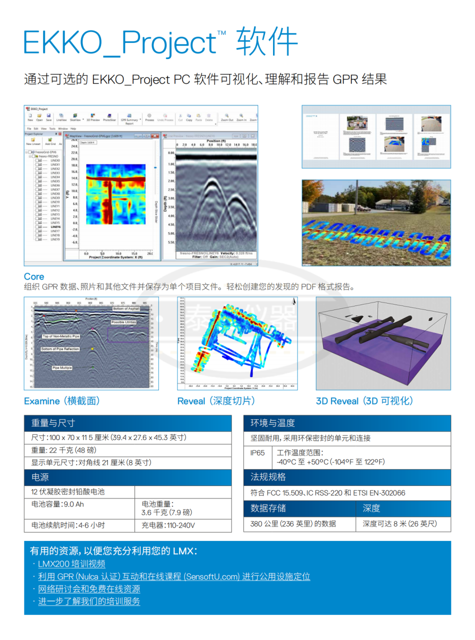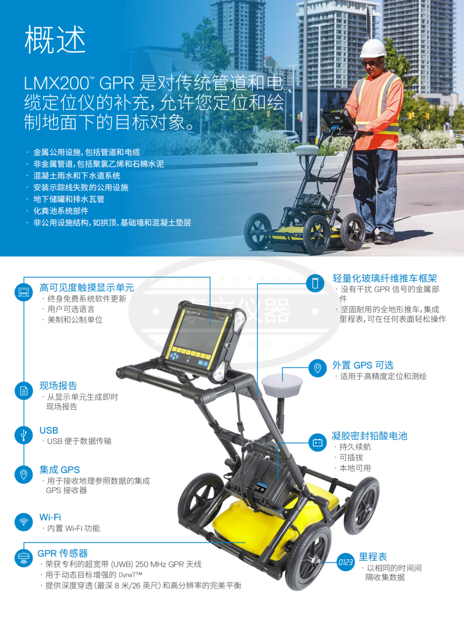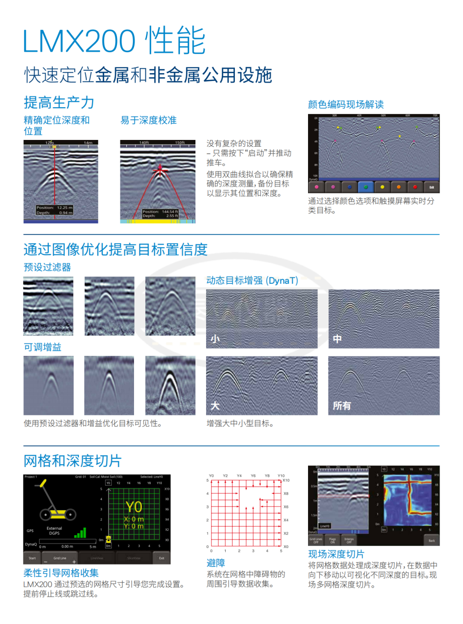 LMX200™ 提供的洞察和目標信心來檢測傳統(tǒng)上無法定位的地下特性,例如: 非金屬管道,包括聚氯乙烯和石棉水泥 地下電纜 混凝土雨水和下水道系統(tǒng) 安裝示蹤線失敗的公用設施 地下儲罐和排水瓦管 化糞池系統(tǒng)部件 非公用設施結構,如拱頂、基礎墻和混凝土墊層 公用設施系統(tǒng)和地方政府要求對地下系統(tǒng)的位置進行定位和標記。這有助于規(guī)劃項目,避免風險和危害